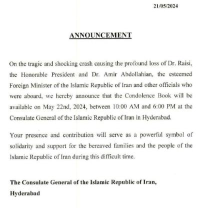 Condolence Book Announcement for Dr. Raisi Dr. Amirabdollahian and their companions
