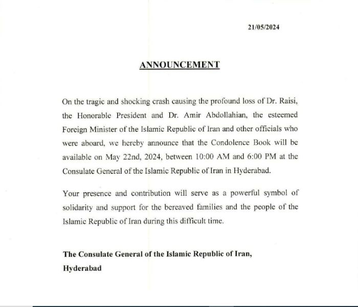 Condolence Book Announcement for Dr. Raisi Dr. Amirabdollahian and their companions