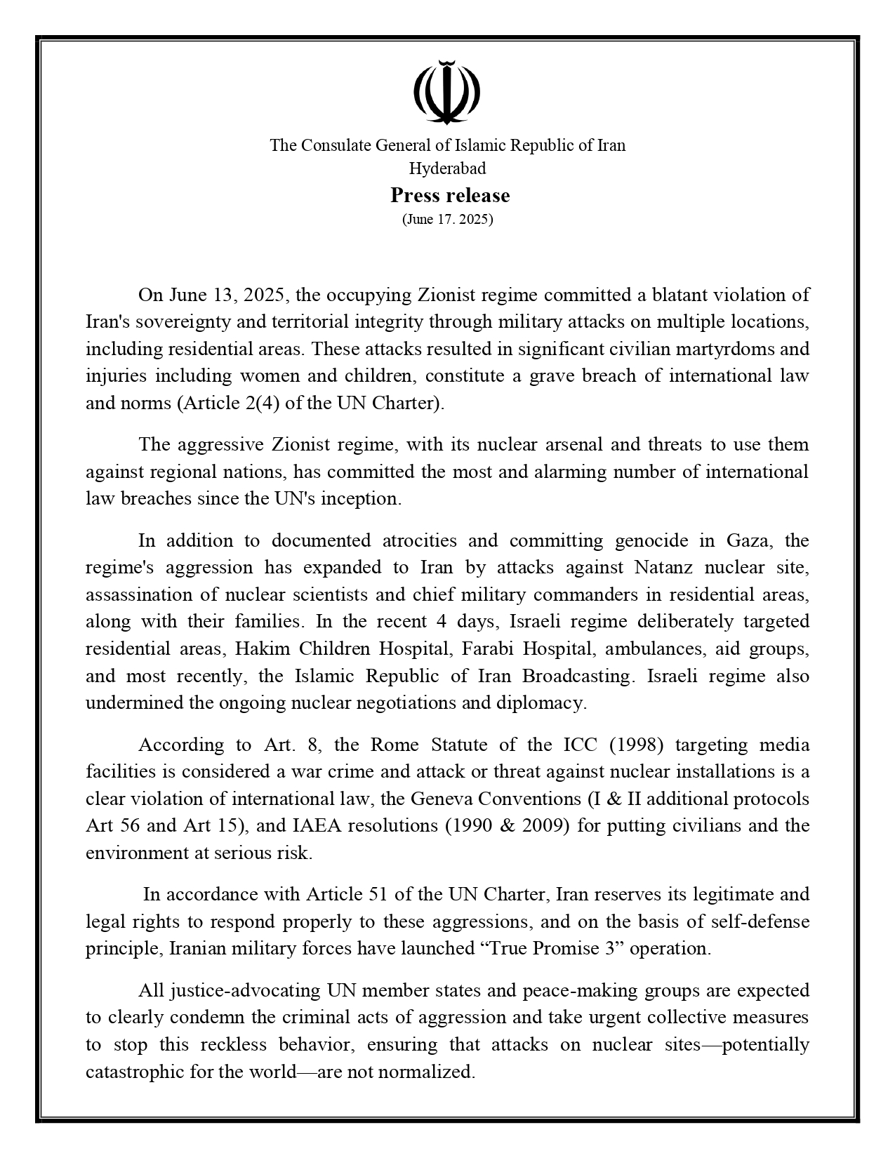 Press release from the Consulate General of I.R Iran in Hyderabad on the Israeli regime's act of war agaisnt Iran.