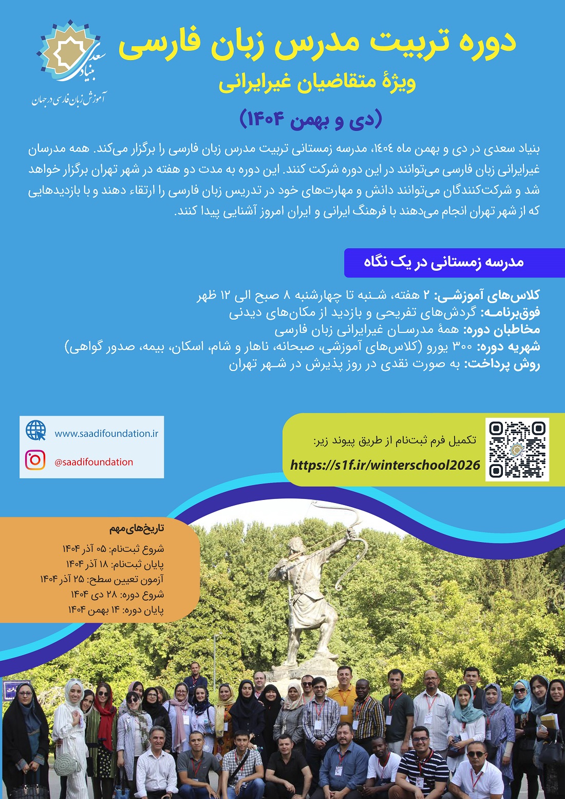 ثبت نانم تربیت مدرس زبان فارسی ویژه متقاضیان غیرایرانی 1404 از سوی بنیاد سعدی آغاز گردید. لطفا برای کسب اطلاعات بیشتر به فایل ضمیمه شده مراجعه فرمایید.
