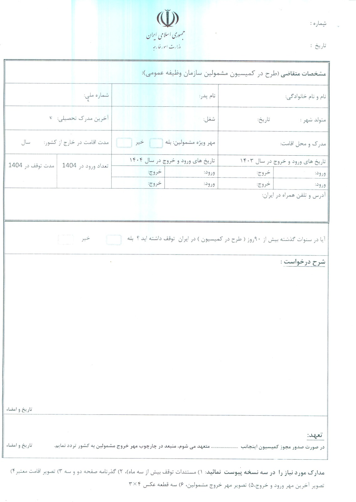 به منظور بررسی ورود و خروج اضطراری بار سوم مشمولین غایب (مانند: فوت اقوام درجه یک و ....) در سازمان وظیفه عمومی‌کمیسیونی تشکیل می‌گردد که آن کمیسیون اختیار ارایه مجوز خروج مشمولین غایب خارج از کشور برای بار سوم را دارد. بنابراین در صورت تایید صحت و سقم موضوع، فرم پیوست بطور دقیق توسط متقاضی تکمیل و به همراه مدارک ذکر شده در ذیل فرم به مرکز ارسال گردد.